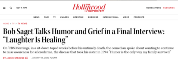 This section is being launched on the day we learned of the unexpected death of a Comic many of us grew up with, Bob Saget. Bob found that "Laughter is Healing" in dealing with Grief.